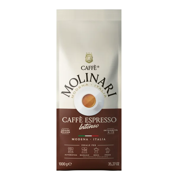 Raffinata selezione di Arabica e Robusta per un caffè corposo, pieno e rotondo, con la classica crema alta e ricca di Caffè Molinari.